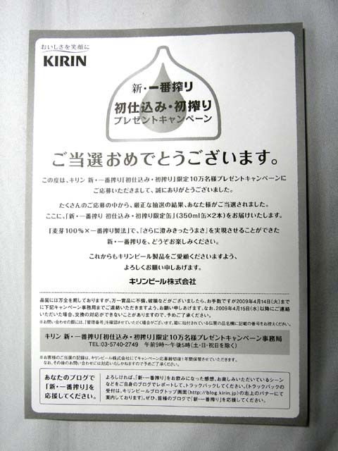 当選 キリンビール 新・一番搾り